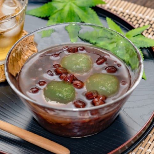 「よもぎ白玉団子の冷やしお汁粉」を400円で販売。