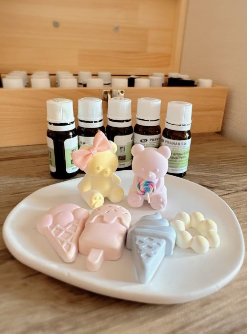 石膏をお好きな型に流し込んで、ご自分の好きな香り2種類をブレンドします。玄関やリビングに置いてリラックスしたり、車のエアコンクリップに付けても楽しめるオリジナルアロマストーンです。