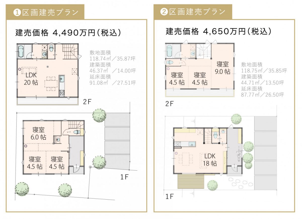 ●販売価格:建売分譲4,490万円~4,650万円、建築条件付売地1,760万円~1,850万円