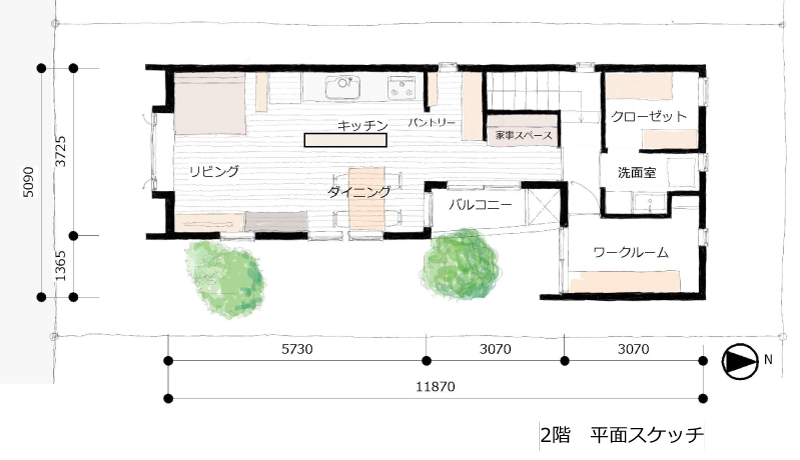 家族が長い時間を過ごすLDKを、まとまった面積が確保しやすく、天井が高い2階に配置しました。2階のトイレや廊下だったスペースをパントリーや家事スペースとしてLDK空間の中に取り入れて、南北に長い平面形状の中に、家族の居場所を点在していくプランとなりました。