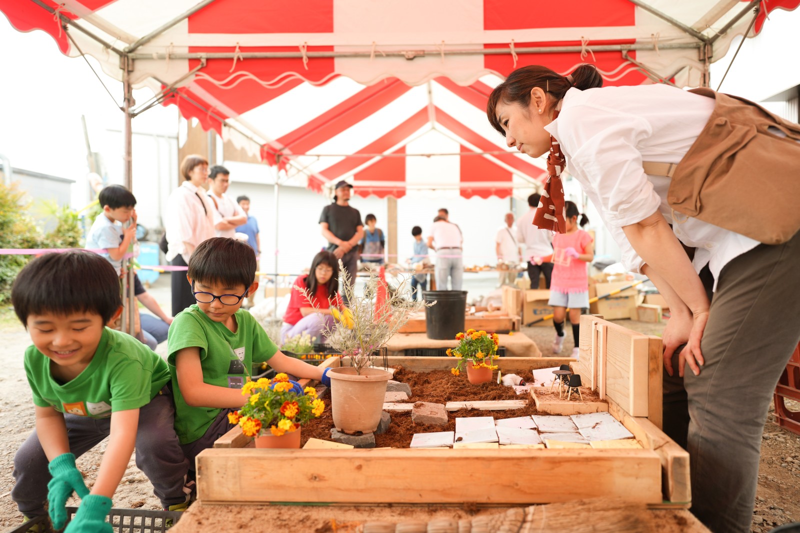子どもたちによってできあがる庭のカタチは様々。お花がいっぱいに置いた子や、木材や石を多く使って立体的なお庭にしたりと、創造力に驚きます。