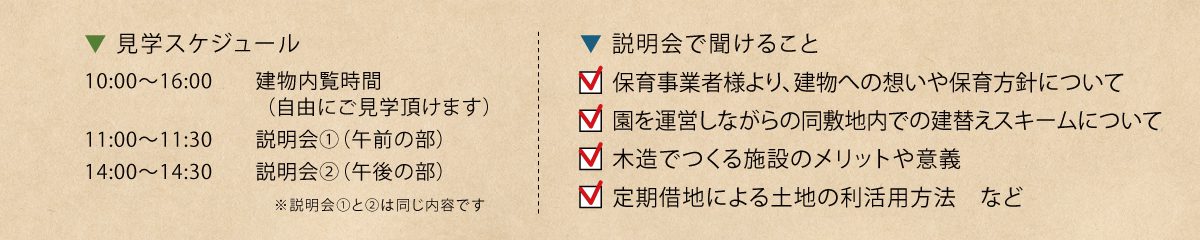 「建物を見学したい!」という一般のお客様はもちろん、木造施設にご興味のあるオーナー様、施設担当者様、建物営繕担当者様、メディア関係者様のご来場もお待ちしております。