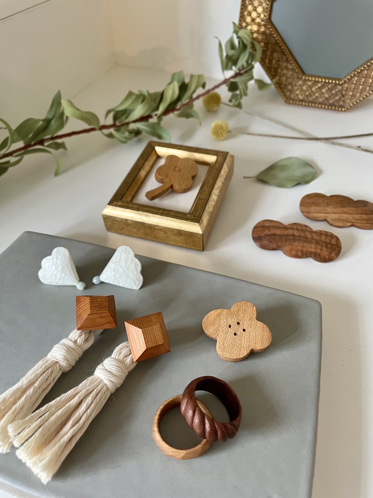 小刀やノミをつかって丁寧に彫り進めた手触り。手になじむ感覚はそんな丁寧な工程からうまれています。ワードローブに合わせたくなるアクセサリーやこんなの欲しかったと思わせるカトラリーなど木の特性を生かしながらデザイン要素も感じるmutouの世界観。ぜひ制作過程など直接伺いながらえらんでみてくださいね。