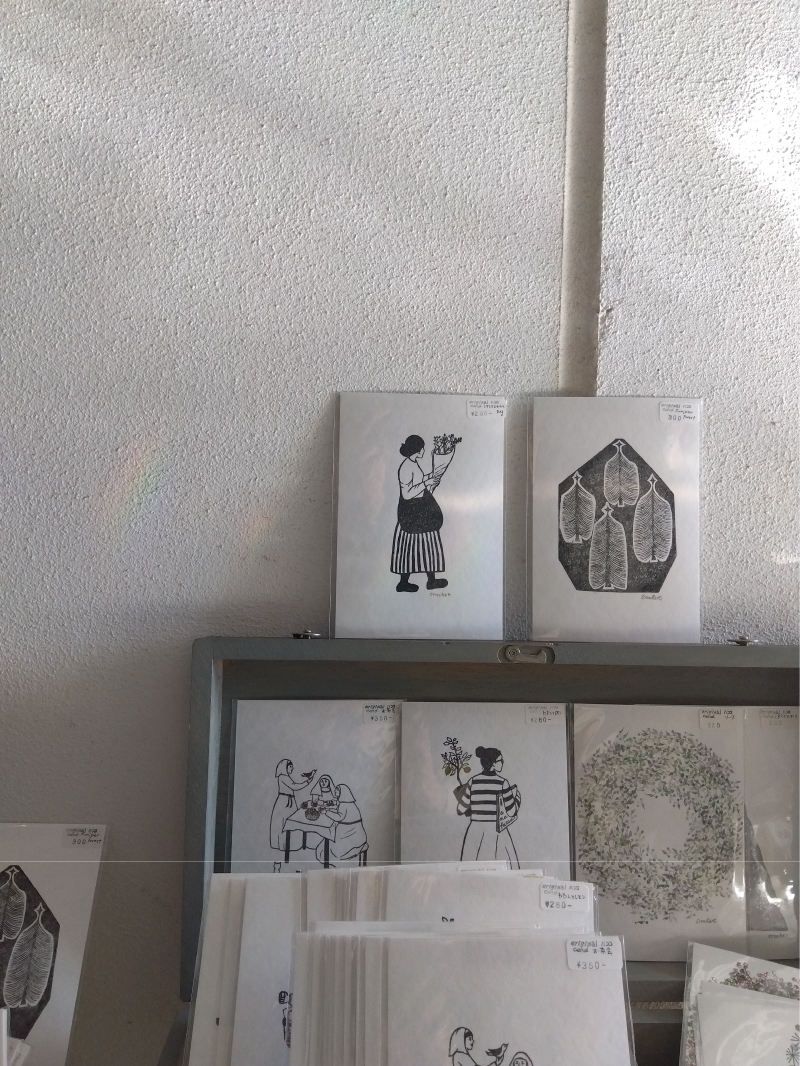 思わず自分の気持ちを添えて誰かに贈りたくなるような、日常にある植物や景色の紙モノ作品をご用意くださっています。『こんなに細かい線まで・・・』と消しゴムに彫っているとは思えないほどの緻密さと奥行が表現された版画作品も新たに加わりました。会場ではオーダーハンコ等のご相談にも応じていただけますよ。
