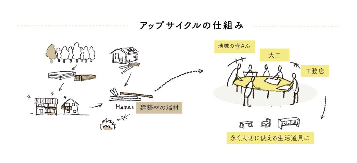手しごとフェスタのワークショップでは、建築時の端材や東村山市内公園の伐採樹木を活用するなど、アップサイクルを意識した永く大切に使える家具や道具をつくります。