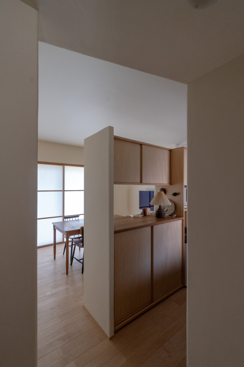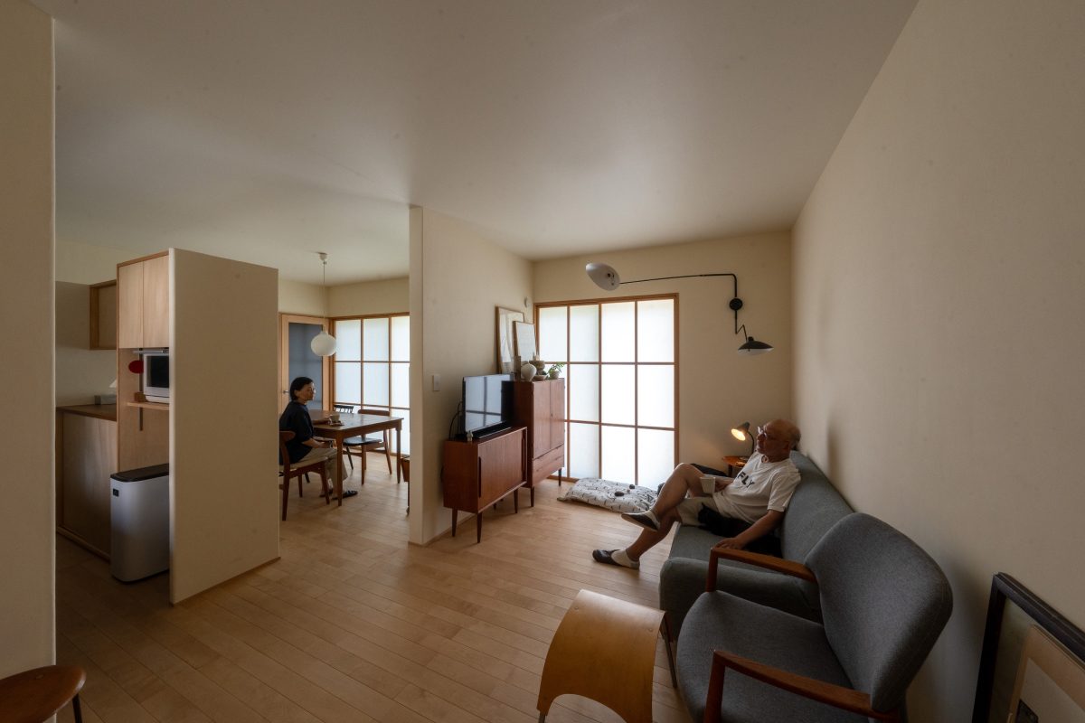 階段で隔てられ孤立した既存のキッチンを、ご夫婦お2人で過ごすLDKの中央に配置し、家事動線が短くなるように配慮。トイレやお風呂などの水廻りをLDKから回遊できるようにして、老後はその一角にベッドを置きWIC・トイレなどの水廻りがすぐ近くになるように工夫しました。これでヒートショックの心配等も解決できる事でしょう。床壁天井の断熱や耐震の性能向上にも努め、熱損失が無いようにロスナイ換気を施してます。