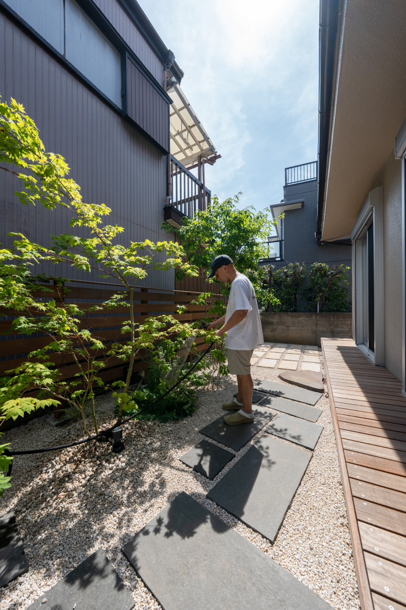 造園デザインは、普段あいばこでリノベーションの設計をしている中村薫さんが担当。植栽も住まい手さんとご一緒に選ばれて、庭づくりの過程も楽しまれています。できるだけお手入れが楽にとの工夫が施されたお庭です。
