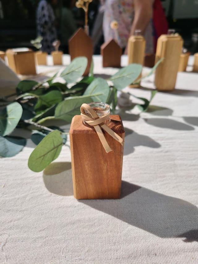 木の一輪挿しやディフューザー、ケーキスタンドなどを販売します。
