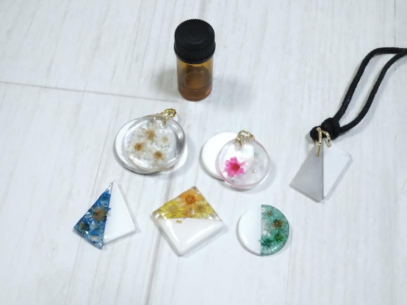 アロマとレジンを使用したアクセサリー。お好きな香りを手軽に持ち運べます。