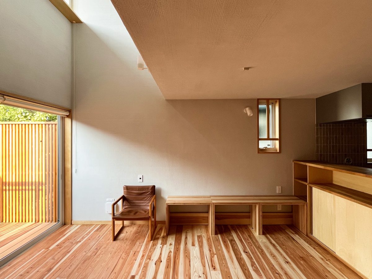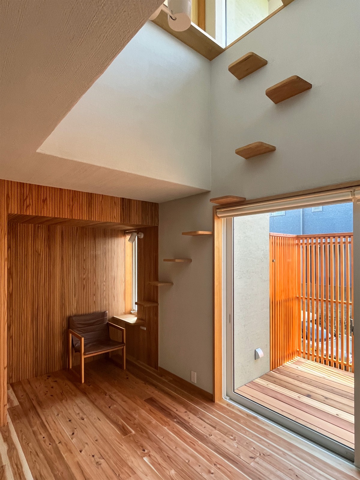 開放感を感じながらも、 時には籠り感のある場所で過ごしたり、周囲からの視線や、猫君たちの脱走の心配を気にしないで庭の緑や外の空気が楽しめるいえになればと考え「ちぐらハウス」と名前をつけました。