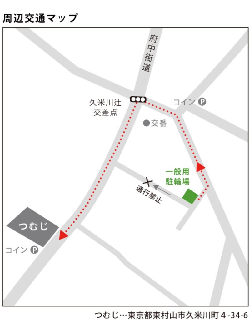 *駐輪場からつむじへの行き来は、必ず「久米川辻交差点」の信号を渡ってください。信号や横断歩道のない場所は危険ですので横断しないでください。