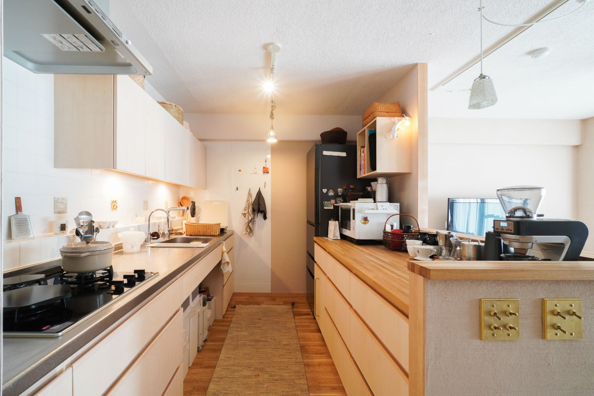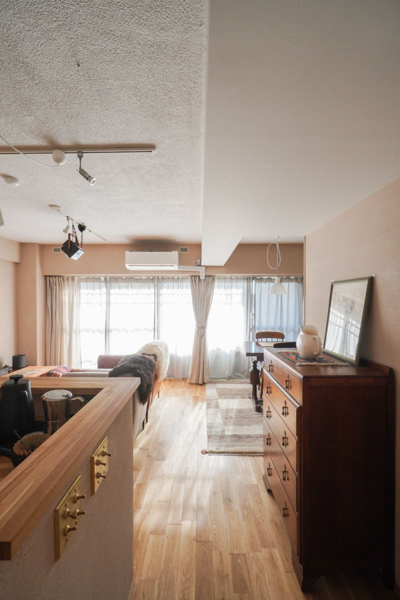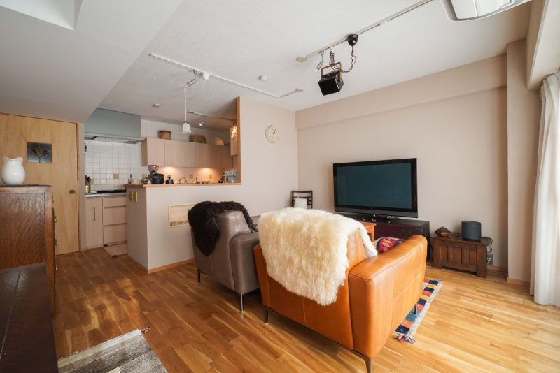 リビングの壁は薩摩中霧島の左官仕上げ、居室の床はナラ材で各室オールフラットに。キッチンは広さと奥行きを確保し、両壁はマグネット仕様で吊戸棚はコンセントを備えたりと工夫が凝らされています。3年前にリノベーションしたものの、オーナー様は仕事の関係で週に2日帰る程度だったそうで、実質生活した時間を考えると1年程とのこと。まだまだ現役なこのお部屋を大切に引き継いでくださる方、お待ちしております。