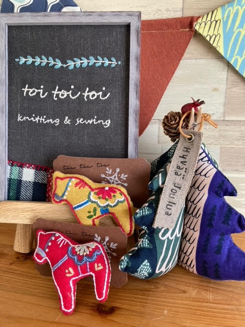 手刺繍のブローチや北欧テイストの布雑貨、クリスマスに向けた小物もご用意します。