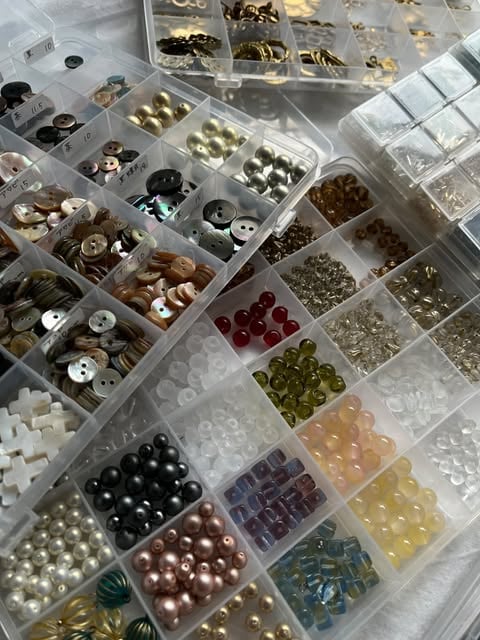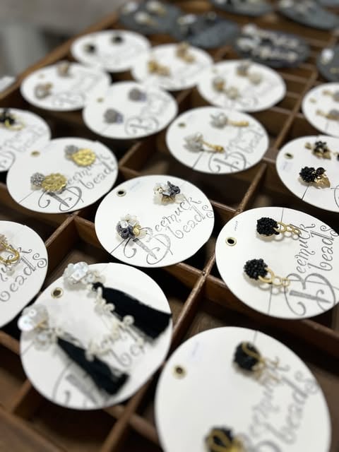 ガラスビーズやシェル、パールなどをひとつぶずつ丁寧に刺繍して作るアクセサリーです。