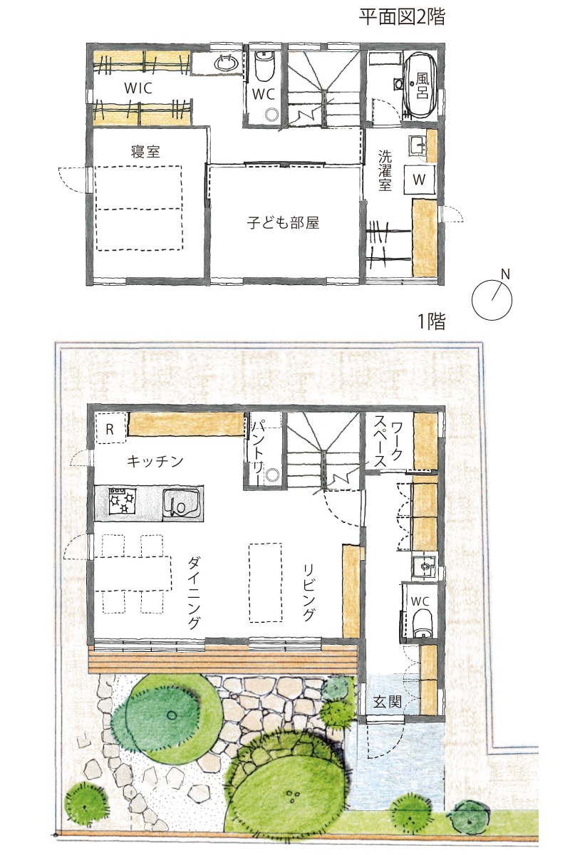 キッチンにはパントリーを設け、玄関脇には鞄などをしまえるロッカーのような収納スペースを備えてそれぞれ収納を集約。2階には寝室、子ども