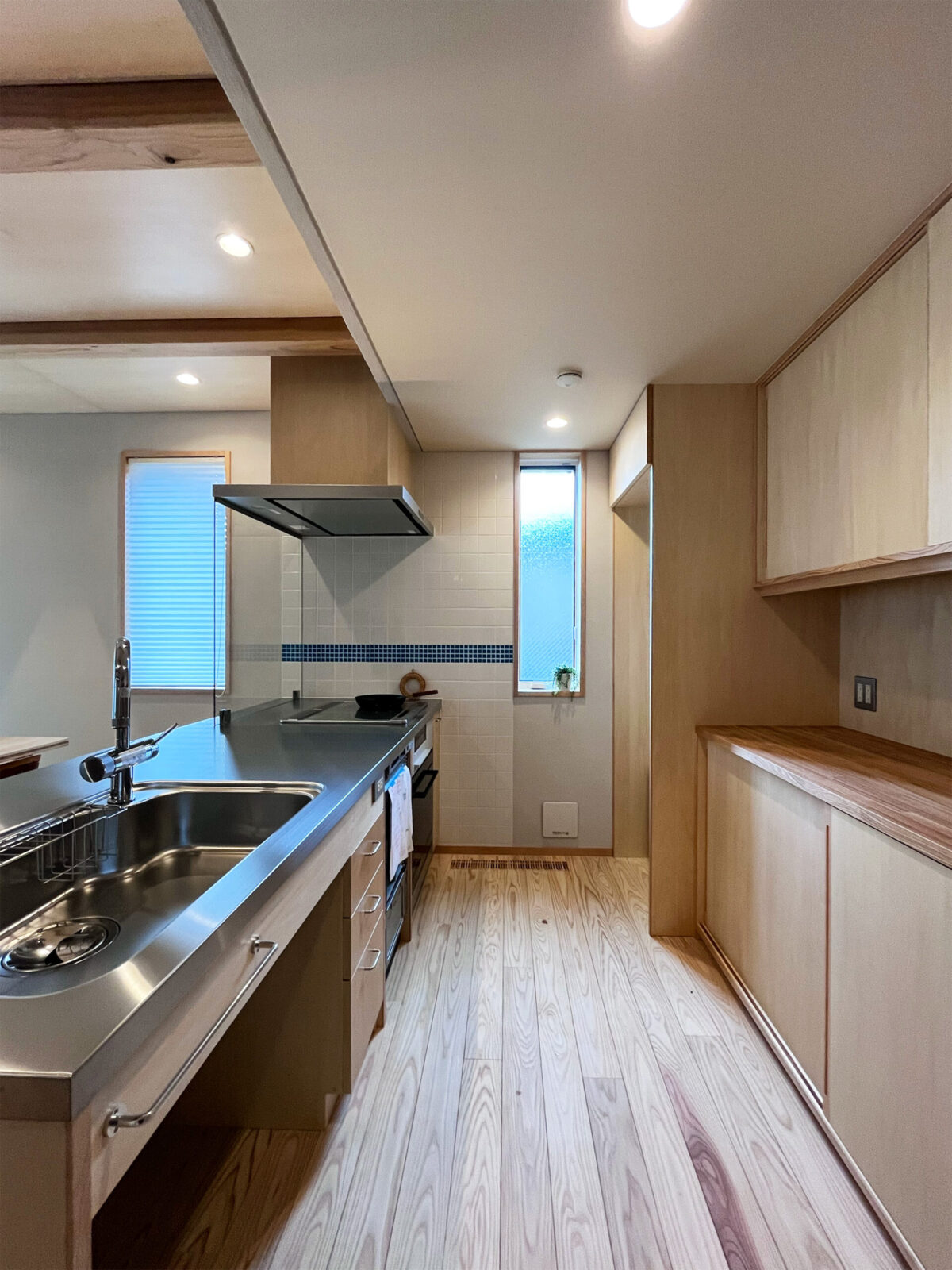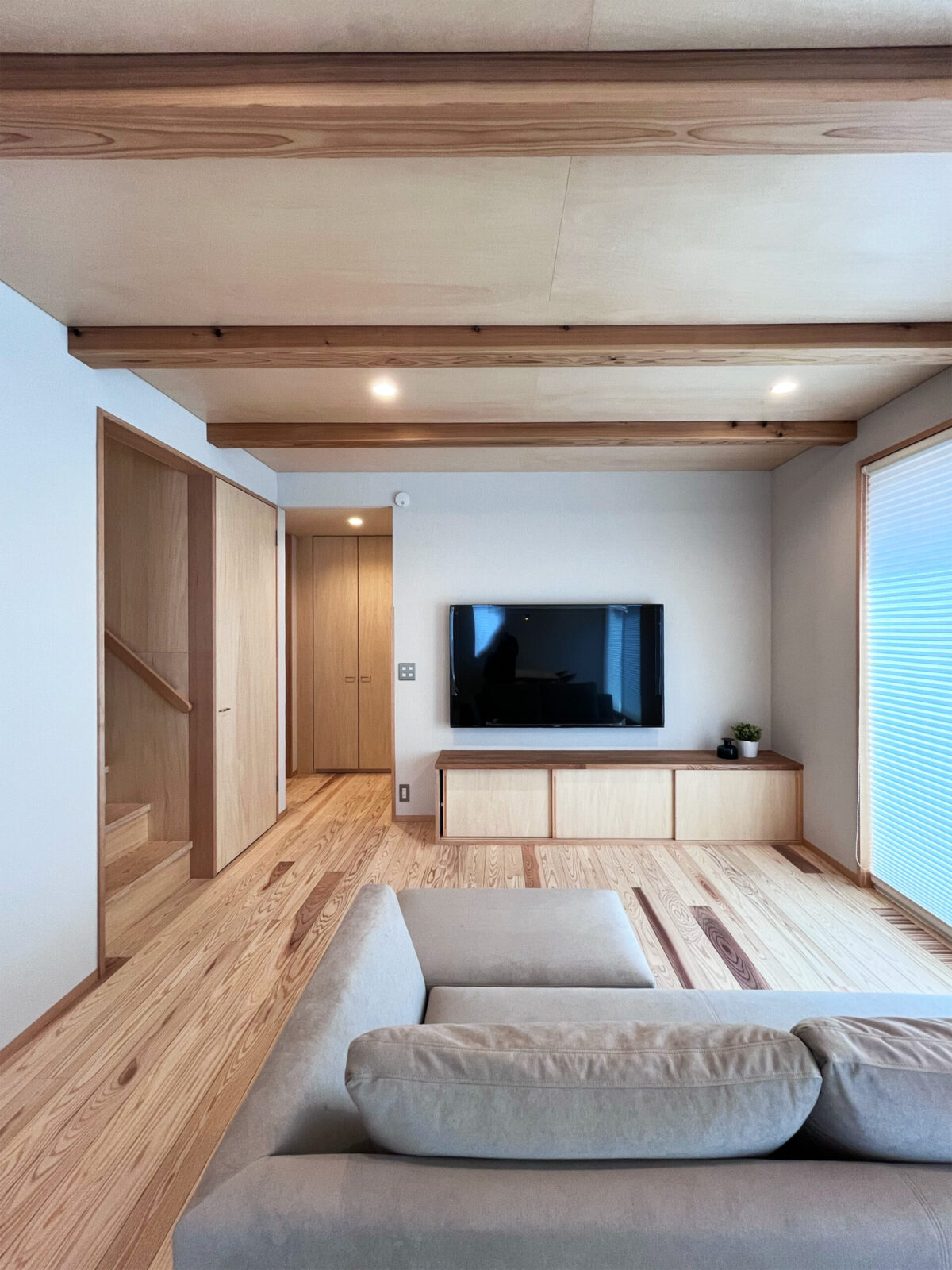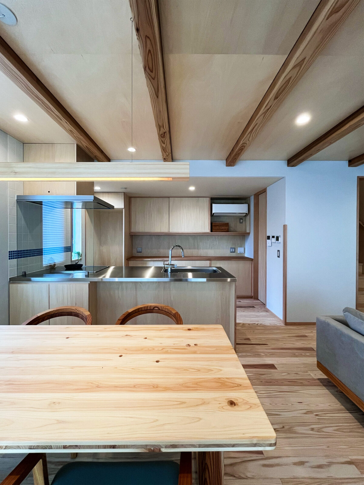 周囲に住宅が密集する環境ですが、あえて1階にLDKを設け、庭との関係性を優先しました。庭を眺めながらくつろいだり、気候の良い日には外でバーベキューを楽しんだりと、外部とのつながりが日常を豊かにしてくれると考えています。