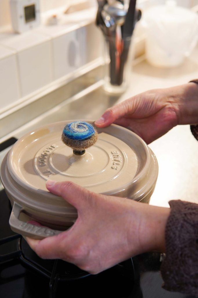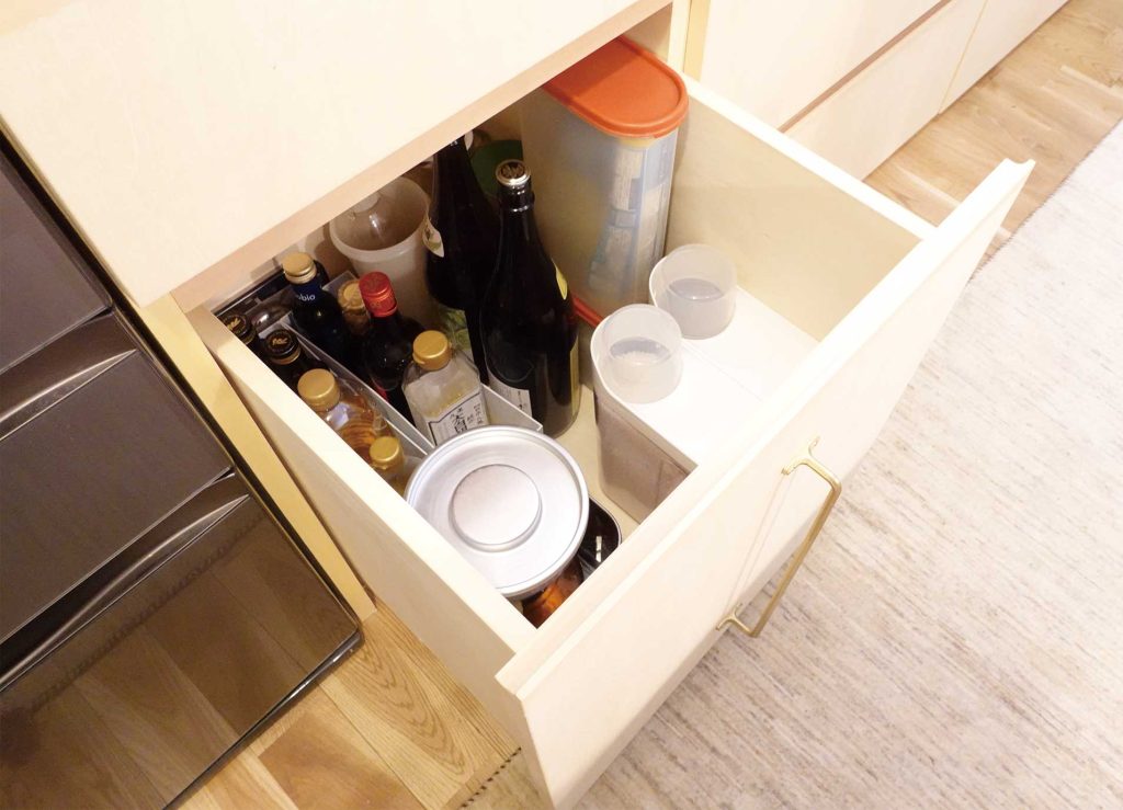 羊毛作家のオーナー様。キッチンとしても制作スペースとしても使いやすいような広さと奥行きを確保。両壁はマグネット仕様に、吊戸棚はコンセントを備えたりと工夫が凝らされています。