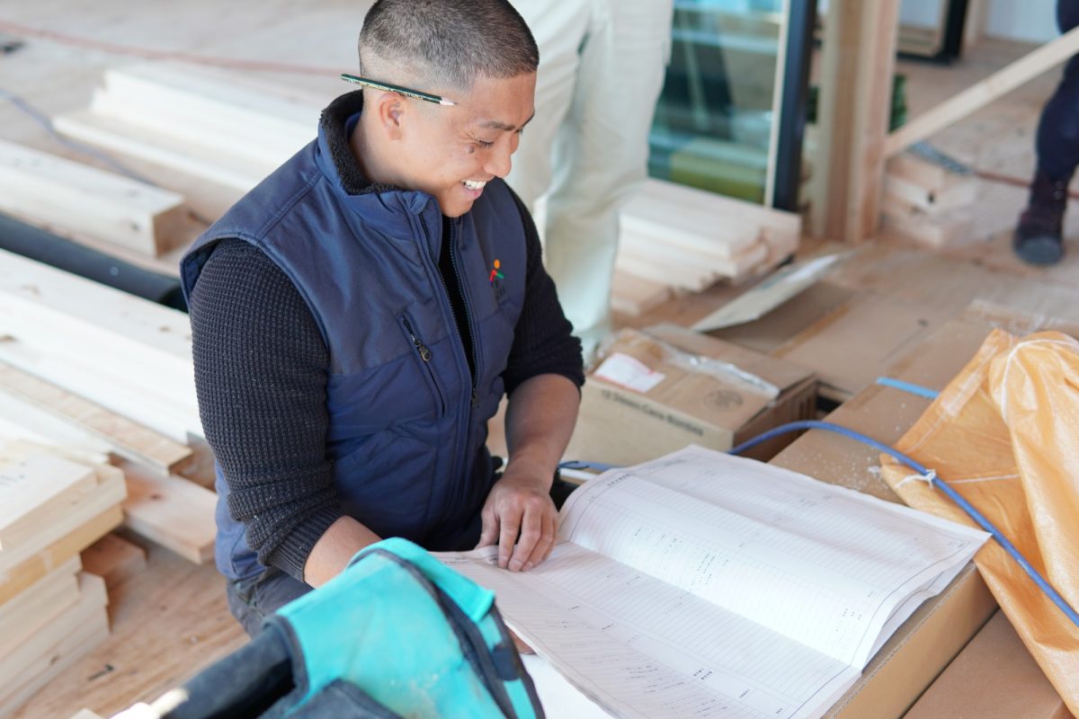 親父が大工をやっていて相羽建設のパートナーとして働いていたから、せっかくならやってみようかなと思って相談しました。顔合わせで初めてベテラン棟梁の秋山さんに会った時、オーラがあって「ああいう大工になれるように頑張りたいな」と思った。大工の仕事は、嫌いだったら無理だけど、すごく好きではなくても続けられるようなやりがいを感じます。