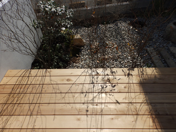 リビングと和室を屋外でつなぐウッドデッキを中心に広がる庭。二つの居室の窓からの風景とデッキに注ぐ風と光と、大らかな広がりを作りながらも、ゆるやかに二つの庭を分けるようなイメージで植えたのが、コバノズイナ・サライブ。普通のコバノズイナに比べて赤味を帯びる花で、もう一つの特徴はやや立ち上り気味に育つ姿。それを活かすようにデッキに沿って二株植えました。