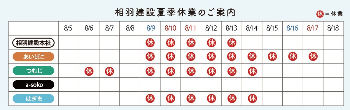 お問い合わせやメール等のご返信は、8/14(木)から(*メンテナンスリフォームについては8/18(月)から)随時対応いたします。