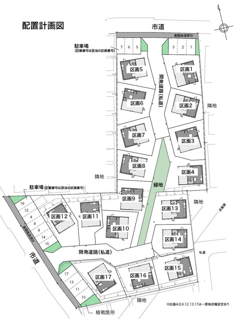 17区画の土地と2タイプの建物の組み合わせの中から、緑との関係や環境、庭のサイズなどを手がかりに、お好みの区画を探してください。