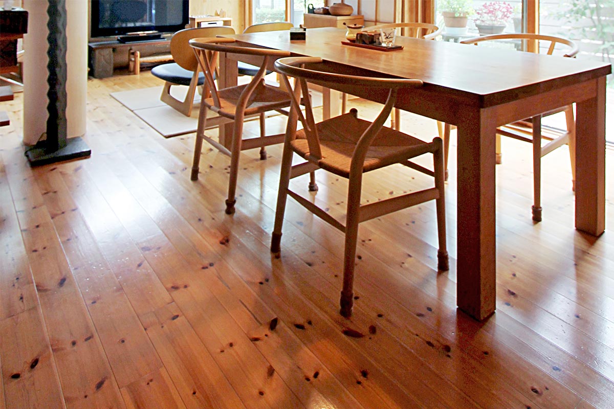 どんな素材も時間が経てば劣化していきますが、自然素材には時間を積み重ねただけ味わいを増すものが多くあります。床の無垢板フローリングは、最初の頃は汚れや傷に対して気を使う面もありますが、年とともに色が深まる中で汚れや傷も目立たなくなり、美しさを増していきます。