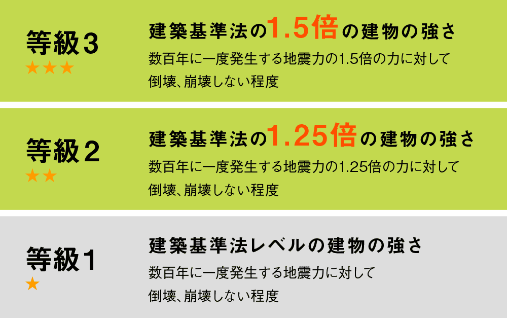相羽建設が施工する住まいの耐震性能は、品確法(住宅の品質確保の促進等に関する法律)の住宅性能表示制度に基づく、耐震等級3を確保しています。耐震等級3とは、建築基準法レベルの建物強さの1.5倍の強さです。長期優良住宅を取得する際にも必要とされる性能です。