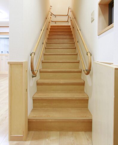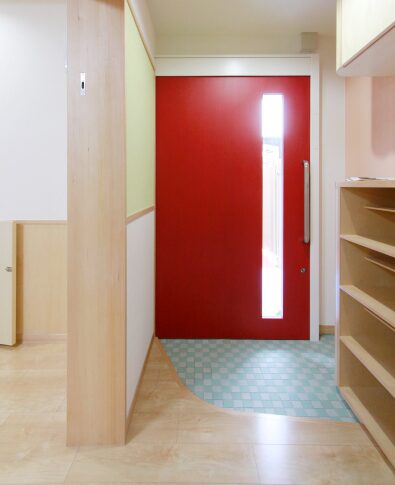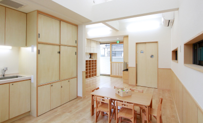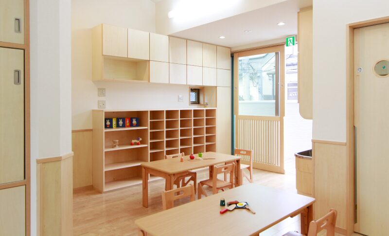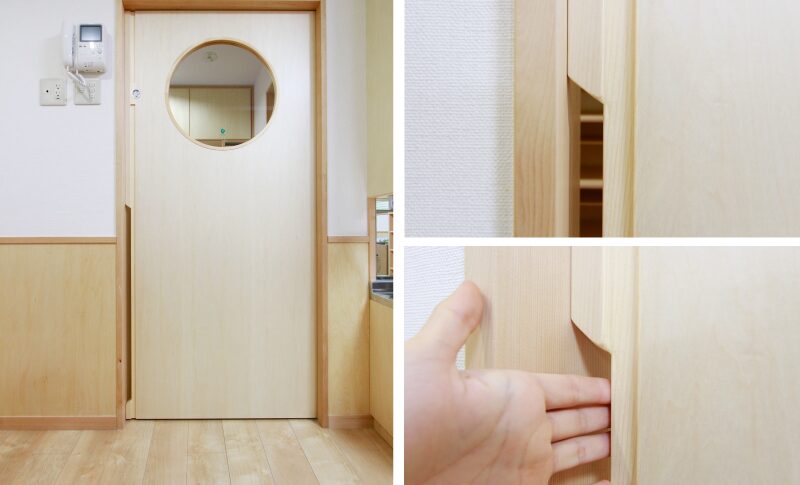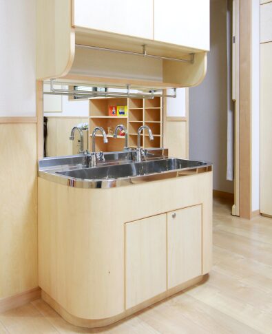 机や洗面台・トイレなどは、通常の住まいとは異なる保育園ならではのコンパクトなサイズ感。さらに、子どもの背丈の高さまで数センチ隙間を開けてつくられた引き戸部分は、「誤って手を挟まないように」という設計士さんの思いやり。それを建具屋さんが手仕事で丁寧に仕上げています。設計士さんや家づくり職人さんの、子ども達のためのこんなちょっとした工夫が園内のいたるところに施されています。