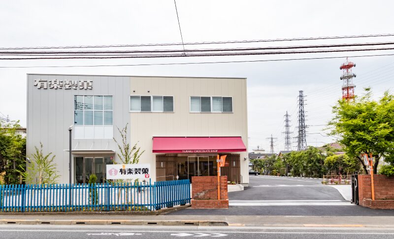 建物面積1,303平米。チョコレート菓子のブラックサンダーでお馴染みの有楽製菓の工場兼直営店。以前は知る人ぞ知る工場の窓口のみでの直売でしたが、新たに店舗としてのスペースを設けることで、よりお客様に親しみやすい場所へと変わりました。